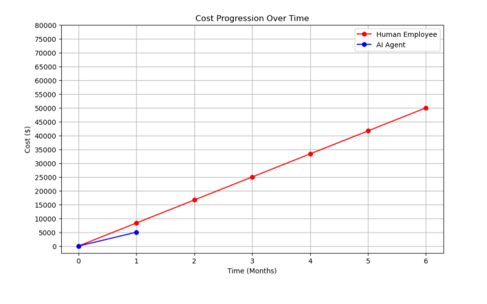 The red line represents the cost progression for a human employee, starting at $0 and reaching $50,000 at the 6-month mark. The blue line represents the cost progression for an AI agent, starting at $0 and reaching $5,000 at the 1-month mark.